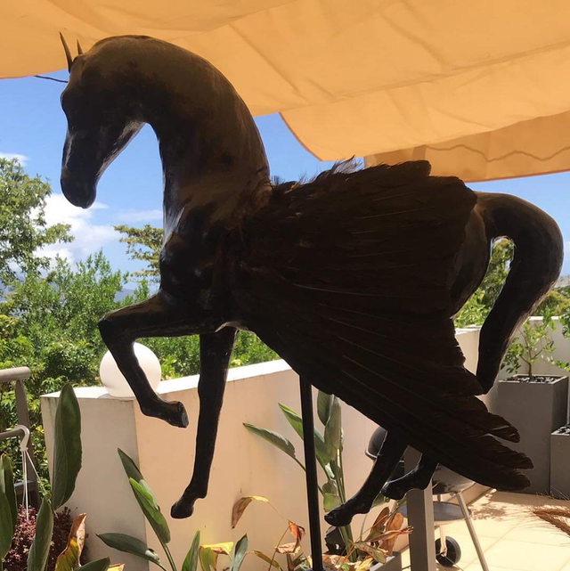 Pégase composé d’un cheval en cuir, d’une paire d’aile de corneille d’Écosse et d’elitres de coloeptere.
